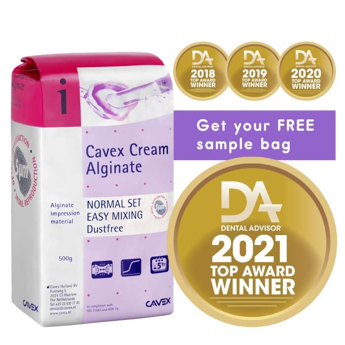 Thank you for your interest in Cavex Cream Alginate. Please complete the form underneath to receive your free bag of Cavex Cream Alginate.