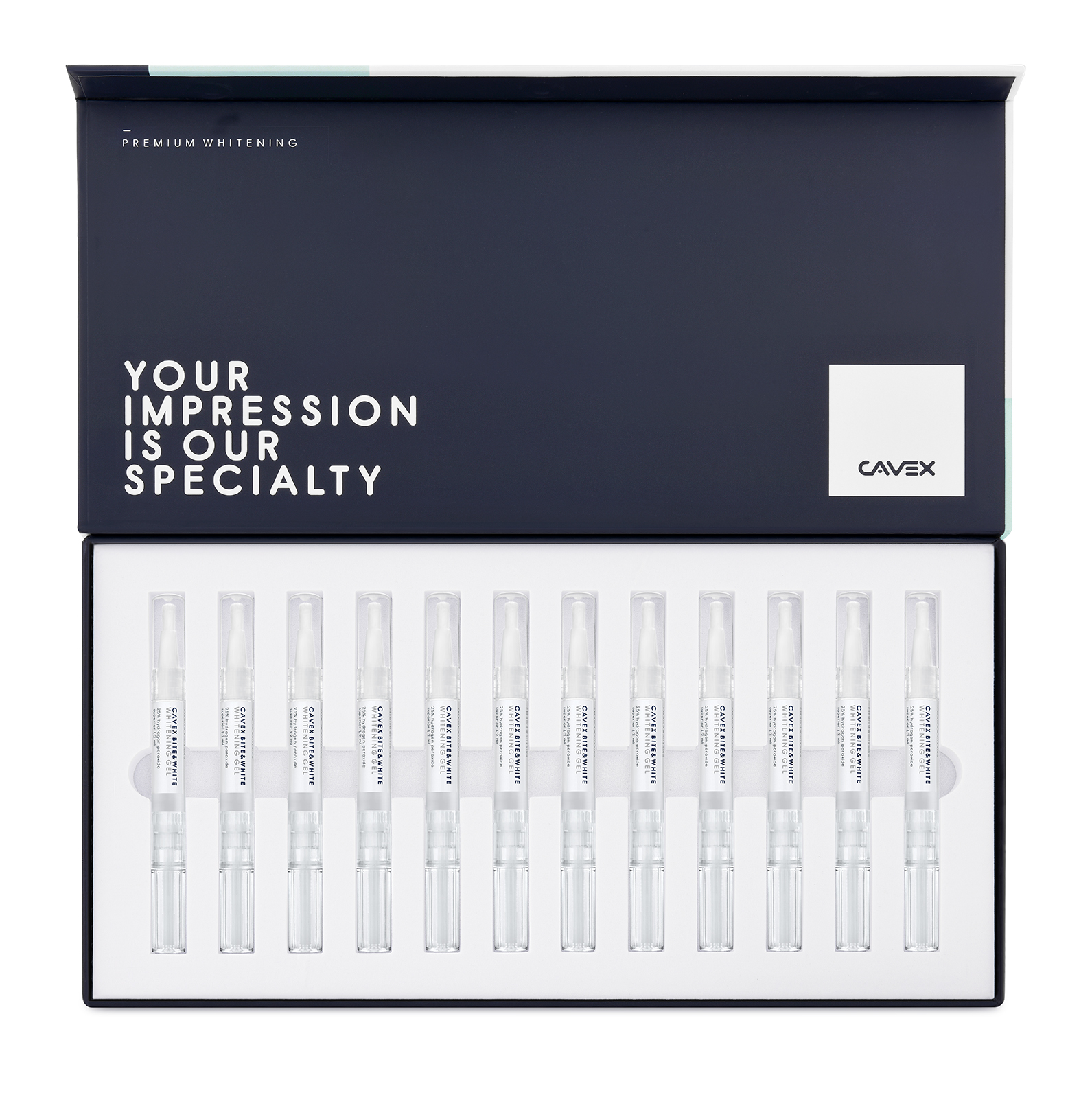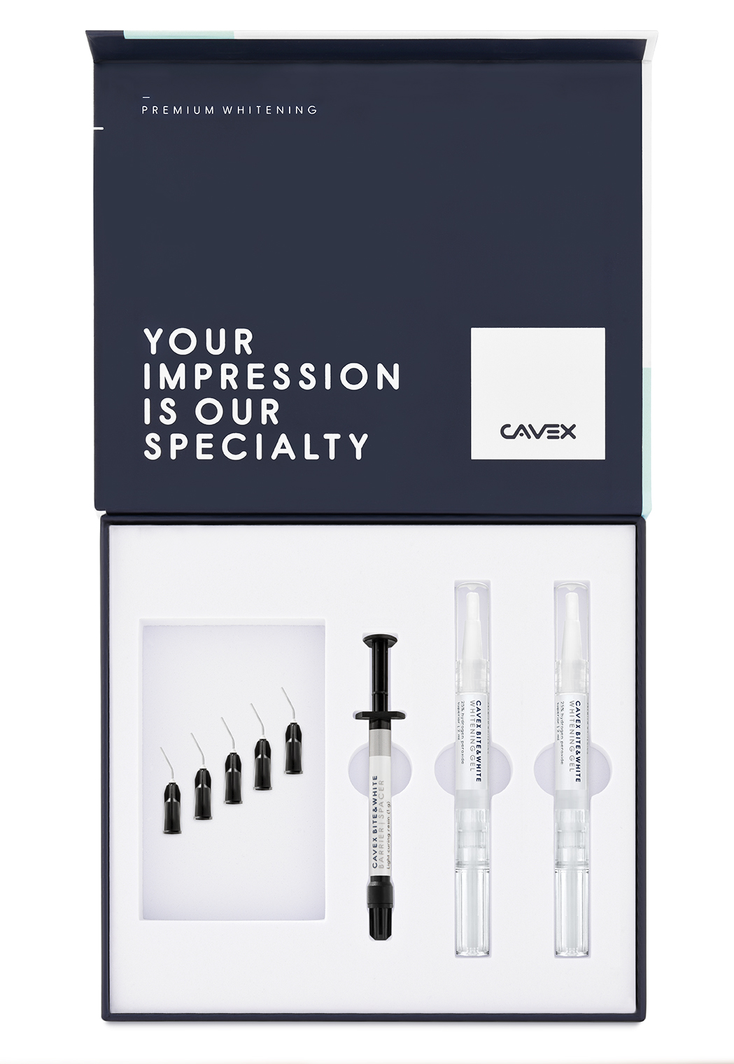 | BW050 | Cavex Bite&White In-Office Starter Pack | 2x Pen (2 ml), 1x Syringe (1 g), 5x Application tip |